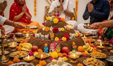 The Annakut festival of gratitude occurs on the first lunar day of the Shukla Paksha! The Annakut festival typically involves preparing a symbolic "mountain of food" (Annakut) which is prepared by devotees and offered to the deity as a mark of gratitude and devotion; a practice directly linked to the original event where Krishna asked the villagers to feed him.