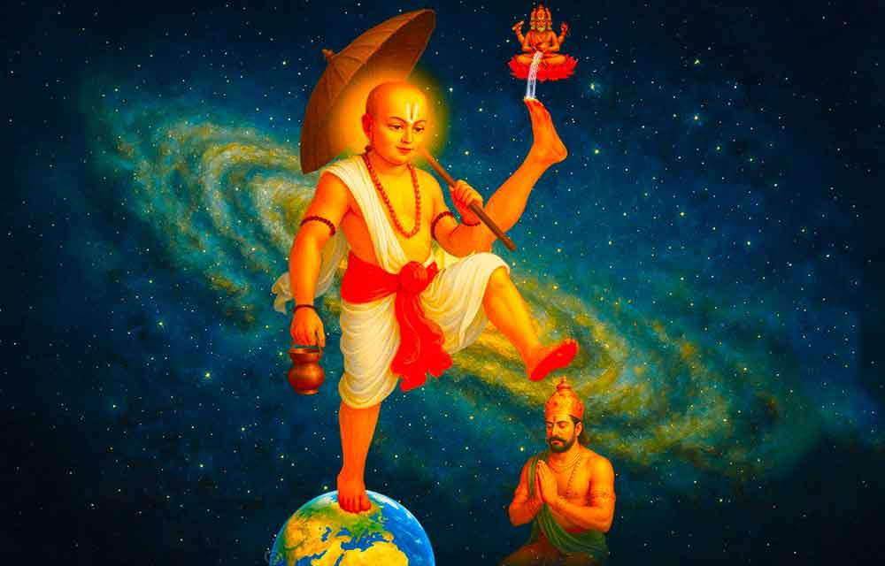 The Bhagavat Purana states that Mahabali's piety was corrupted by his power, leading to arrogance and a distorted sense of humility. To restore the cosmic order, Lord Vishnu descended to Earth as Vamana, a dwarflike Brahmin. Vamana approached Bali who was doing the Ashwamedha yagya and asked for a gift of land that he could cover in just three steps. Despite warnings from his guru, Shukracharya, King Bali's generosity and integrity compelled him to grant the small boy his request and Bali agreed to the seemingly small request. Vamana then transformed into a colossal form, growing to an immense size. With his first step, he covered the entire Earth, and with his second, he claimed the heavens. With no space left for Vamana asked Bali where he should place it.