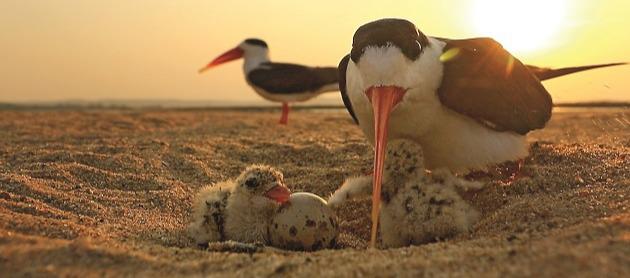 The nests are unique which resemble as scoops in the sand, with eggs laid directly on the sand. They breed in colonies of up to 40 pairs. More often other birds like river terns are found to lay eggs in the same nest. The peak egg-laying period is in April. The parental care is beautifully done by both parents. The female guards the eggs and males transport water in their wings to keep them moist. The eggs of Indian Skimmer hatch in 22 days and the young begin to fly about a month after hatching. After two months the parents and young leave the breeding habitat. Generally, Skimmers depart the colony by August. It is found that the nesting success is very low. In Odisha, 60 percent of eggs survive hatching and 30 percent of chicks survive due to very high rates of egg and chick mortality.