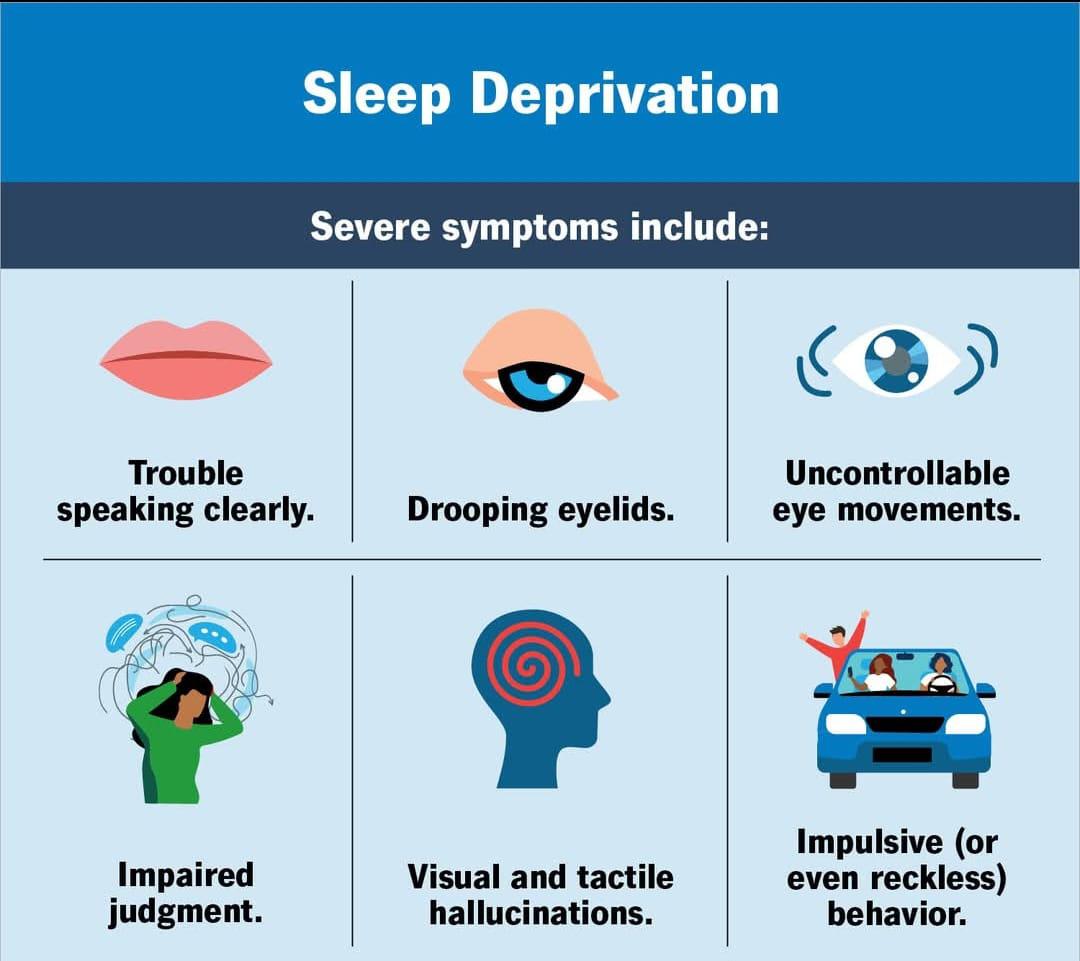 In severe cases, prolonged sleep deprivation can lead to psychosis, characterized by hallucinations, paranoia, and disorganized thinking. Sleepiness can impair cognitive function and reaction time, increasing the risk of accidents while driving or operating machinery. But if you ever need to survive on five hours of sleep , try to keep a regular sleep schedule and get more sleep from naps, if possible, to minimize the effects of the sleep deprivation.