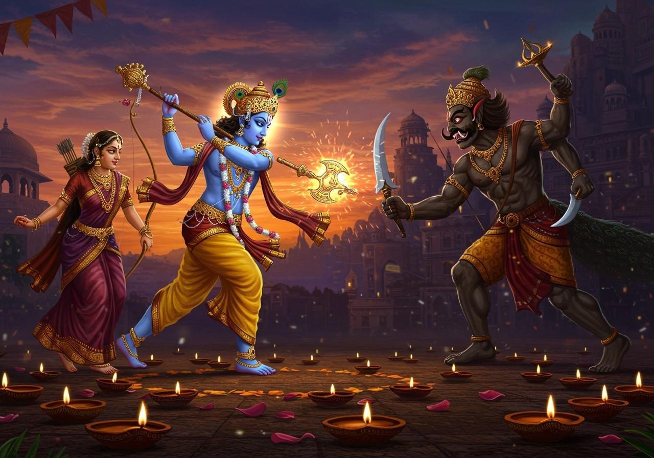 After the battle, traditions hold that Krishna returned before dawn and was massaged with fragrant oils and bathed, which devotees emulate as part of festival rites.The oil bath is understood as both physical cleansing and a symbolic shedding of inner impurities like anger and pride, aligning the devotee with renewal and auspiciousness. In southern India especially, Abhyanga Snana at daybreak on Naraka Chaturdashi is observed as a memorial of Krishna’s post-battle purification and as a prayer for protection and prosperity.
